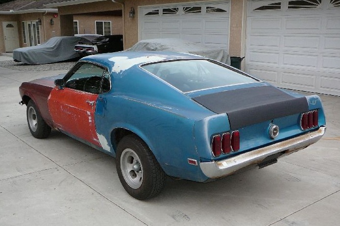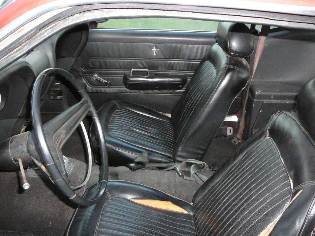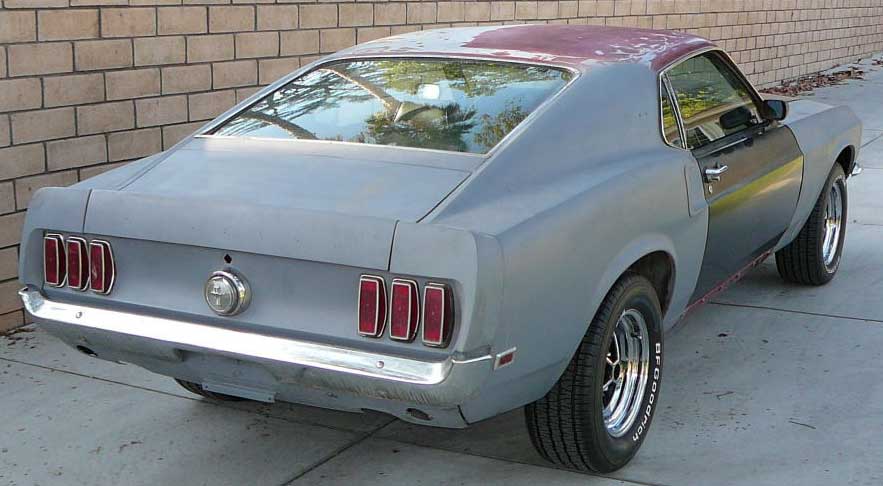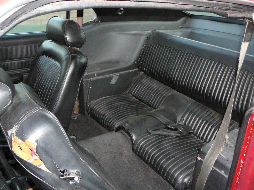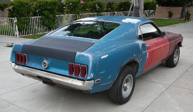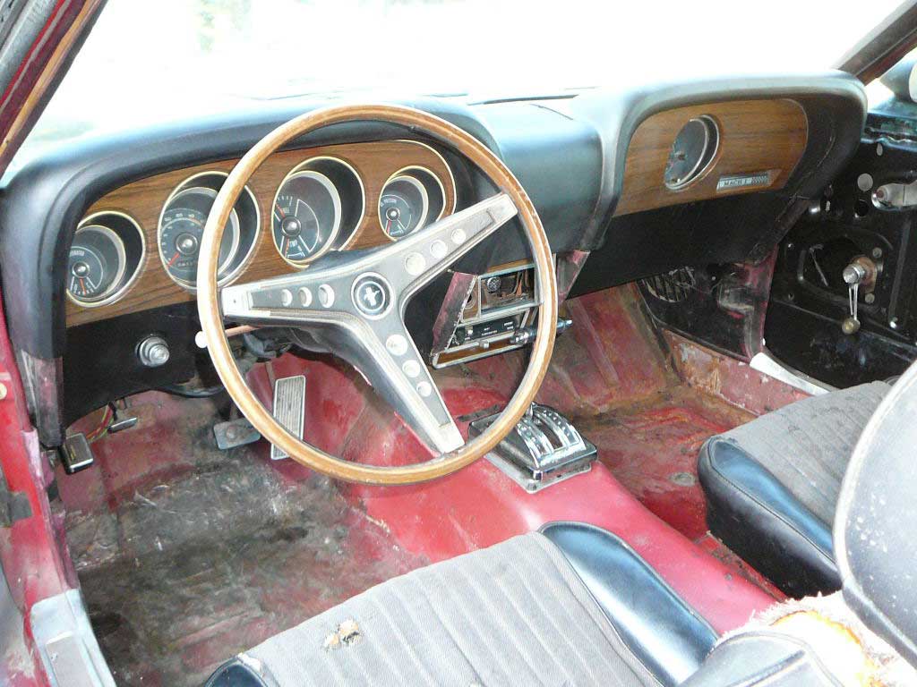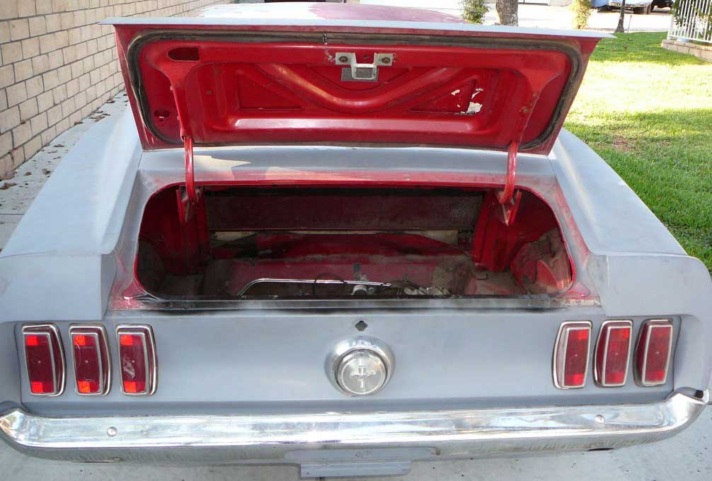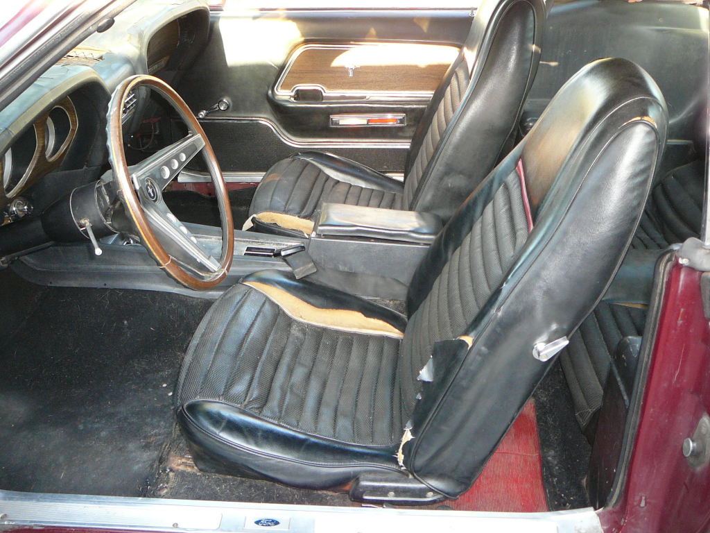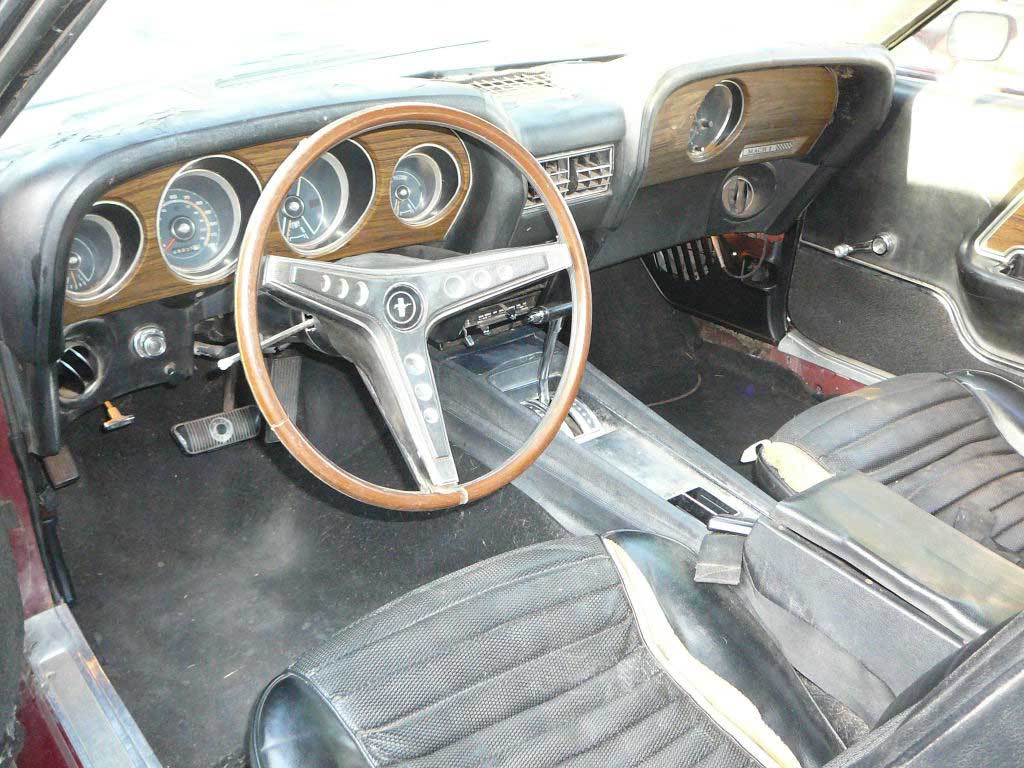 Original 6 cyl with C4 auto. Not loaded up with a lot of options but does have a perfect   fold down rear seat with no cuts to trap door for speakers. Has a Mach 1 style hood and the car drives quite well. Black interior is original but needs redo. Body is very good and rust free except Fastback has had a hit to right hand rear causing damage to quarter panel and outer wheel house. A new quarter skin and wheel house is provided for the repair. Note that 69 Mustangs have 5 stud wheels and run same rear end as V8 Mustangs from 65-68, making an upgrade to say a 302 V8 an easy conversion.
