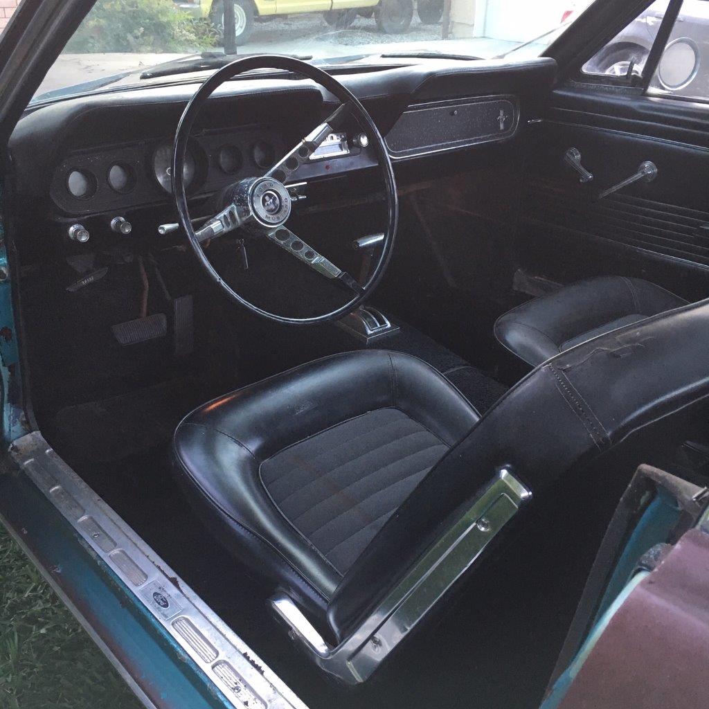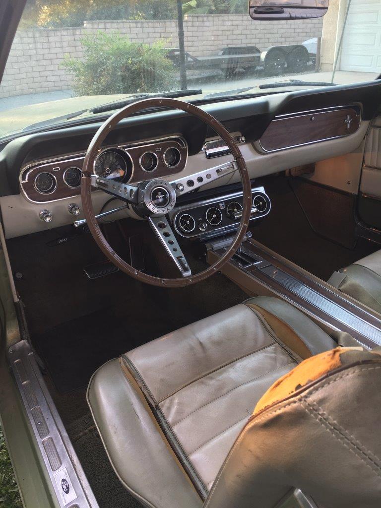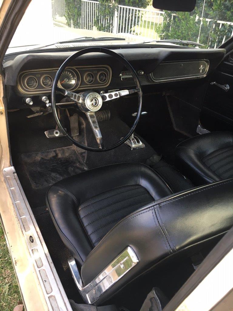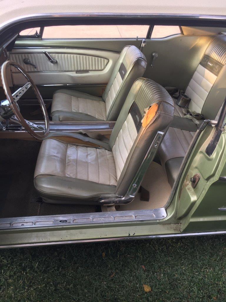 Originally Dark Ivy Green exterior with 2 tone green/white Pony interior.Car was� repainted� a correct Lime Gold 1967 Mustang exterior colour.Paint is in average condition.The vinyl top is original and there are no rust issues showing with vinyl top� eg bubbles . Body is excellent with all original panels and floors .Very difficult to source top body cars out of the US -competition for these coupes is high and stock is short.� Interior is original but is showing its age .