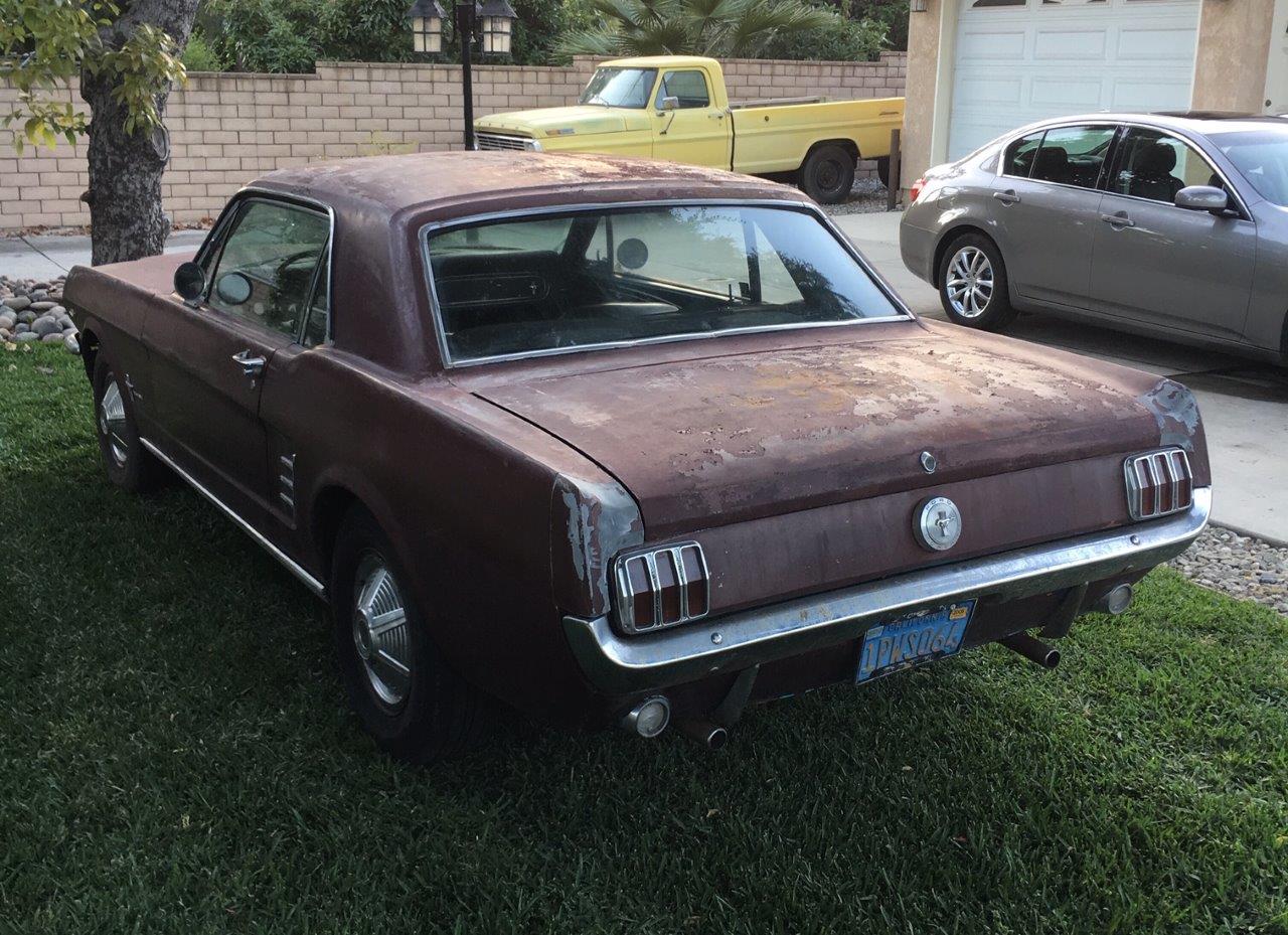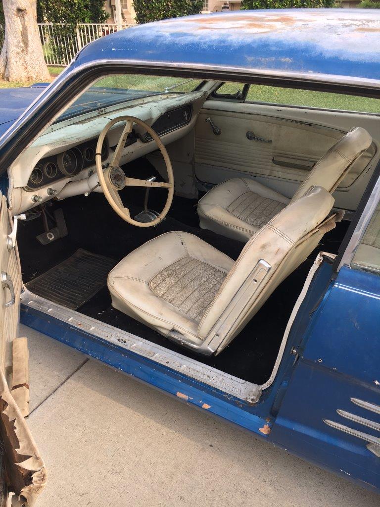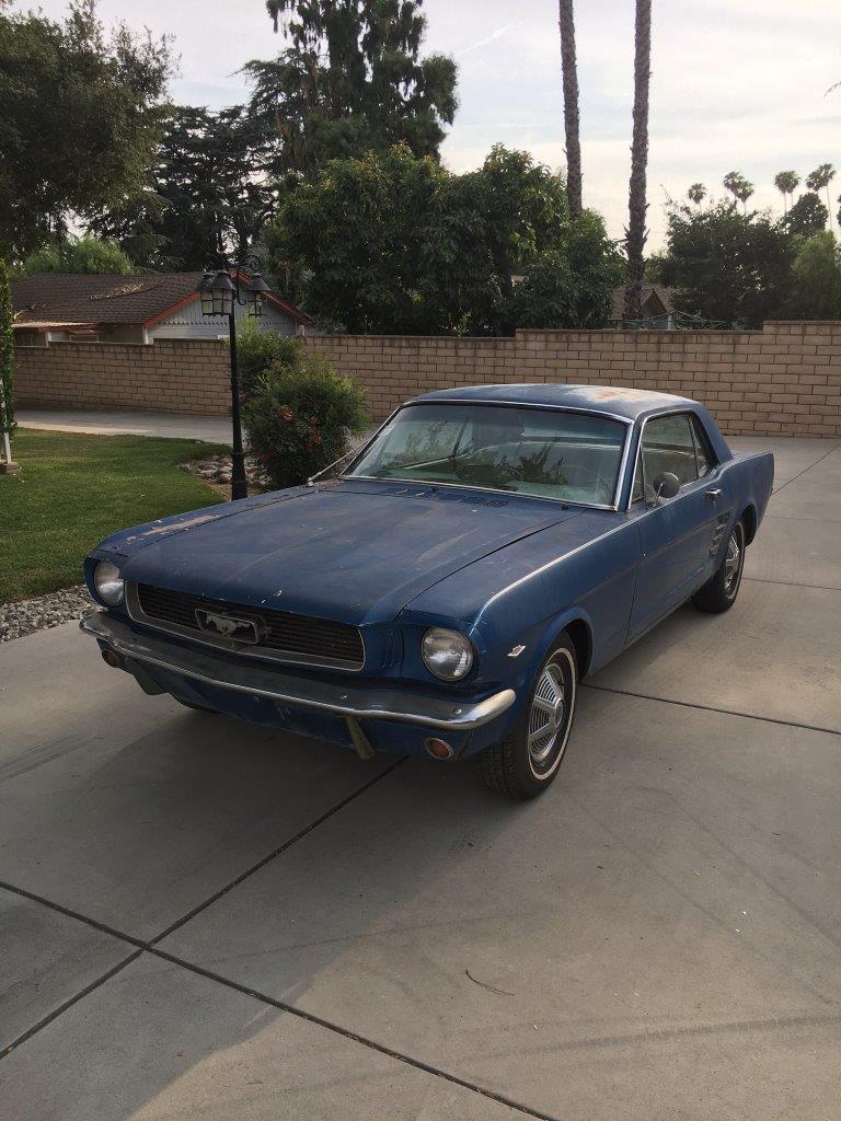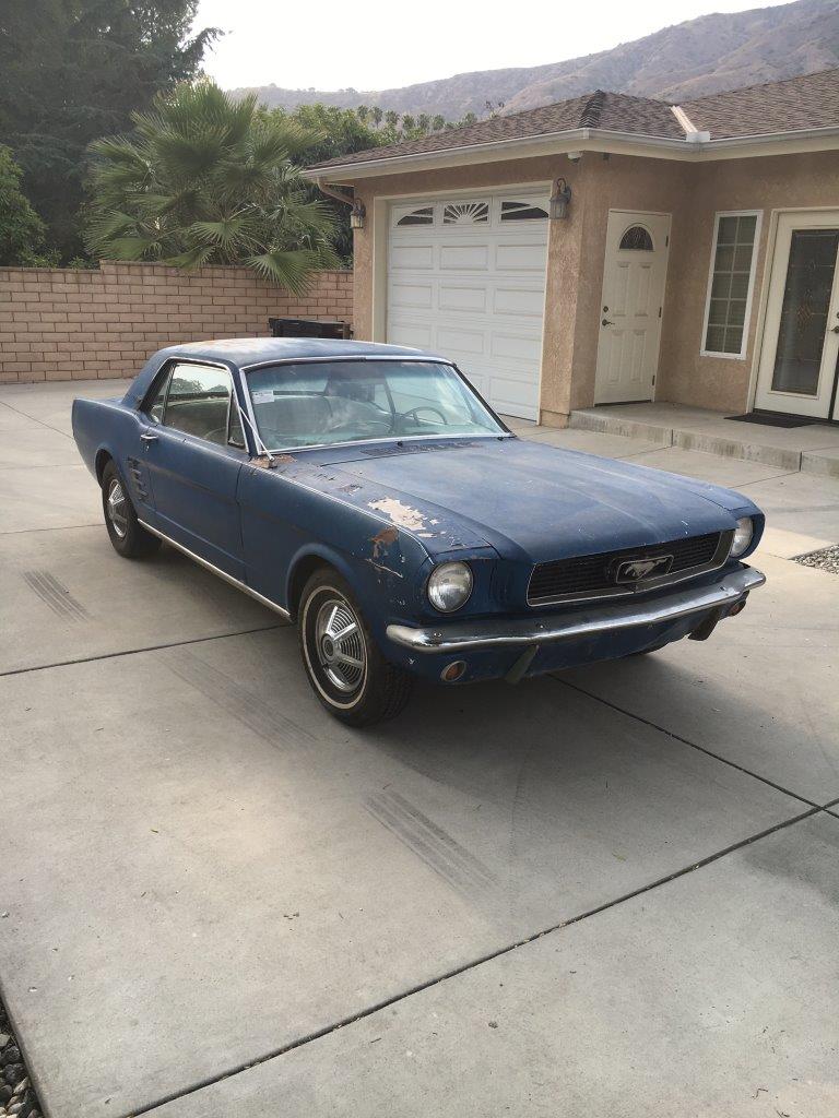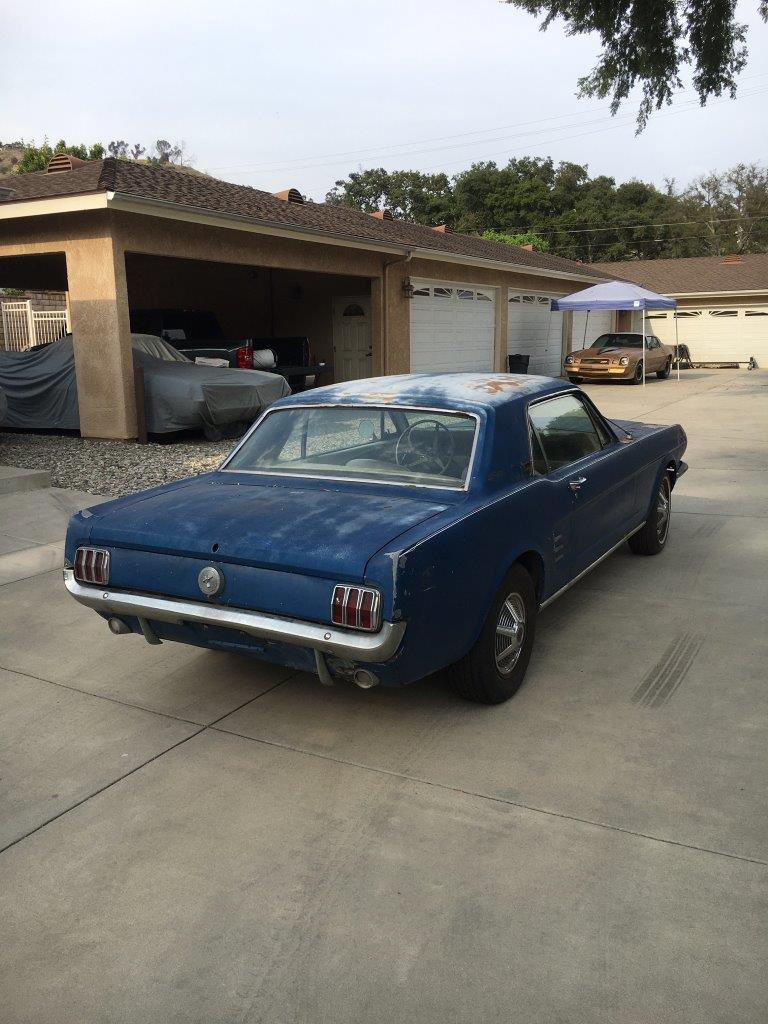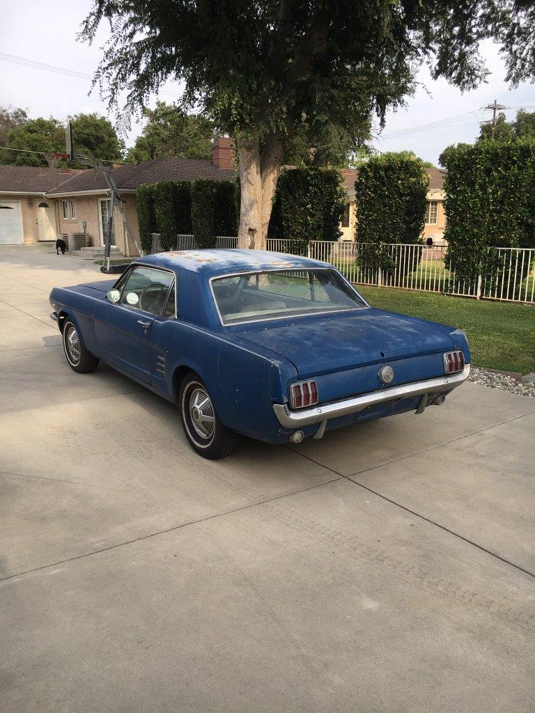 This is a 1966 Mustang coupe- project car. Equipped with the original 'C' code V8 289 2V engine, C4 auto transmission, power steering, & Kelsey factory disk brakes. Engine does fire & run ok but will need carb, tune up parts, & gaskets. Car sat for 20 years so will need full brakes & fuel system at a minimum. Car was rear ended (prior to current blue paint job) on left rear which impacted frame rail & trunk floor. Left quarter will need re skinned after proper frame pull. Right quarter decent & right frame ok. Car has some rust in rear floors, right hand rear 'C' pillar, & a few other small spots. Not a rusted out back east car since it has been in California for most of it's life, but will need some rust repair as noted. Very cheap car with good options & disk brakes for the project enthusiast.