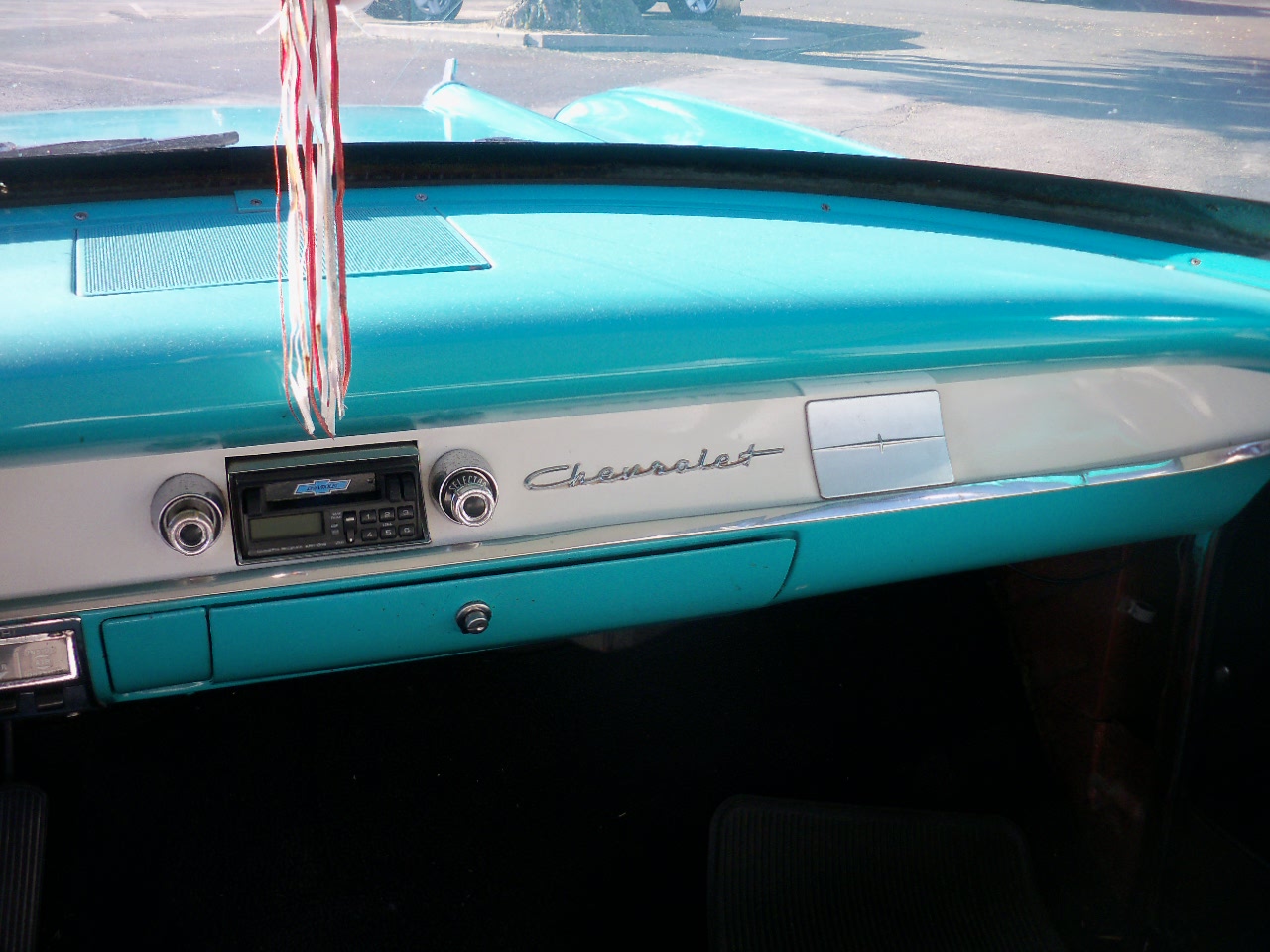 Here is  a good honest 57 Chev that has a 350 V8    with a 4 speed auto with overdrive ,original power steering  and aftermarket air conditioning and Rallye wheels .The Chev was restored some time ago but runs strong -will burn rubber in first and second gear .Strong engine with Edelbrock intake manifold and carby .Large aluminium radiator keeps the car cool .Car runs fine and auto shifts well-brakes are good . Dual exhaust has been fitted and it is in good condition . Sheetmetal is in top condition and floors are great .-no tar coating underneath  just bare brown metal .Bit of rust by the back window and the right rocker panel but no serious issues ..Interior is in good condition and has been redone in original style -steering wheel, chrome inside  and instruments are good . Chrome redone some time ago and is fairly good shape -starting to peal on front bumper .
