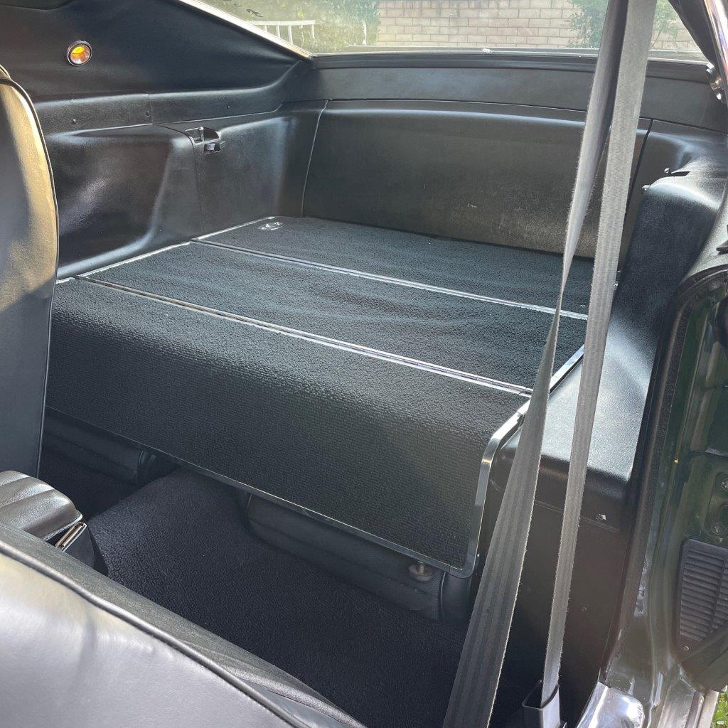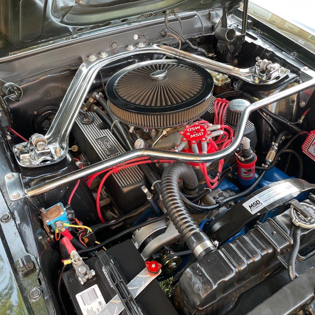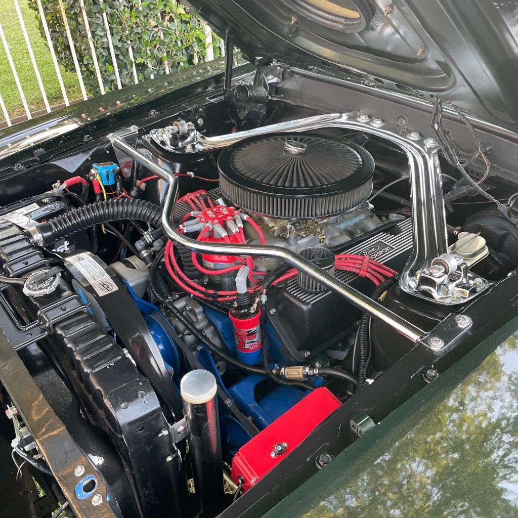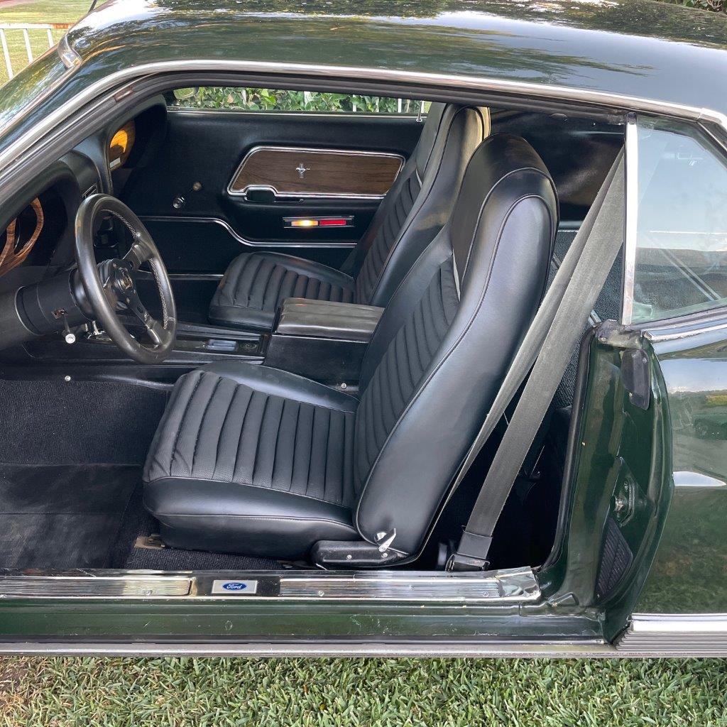 Extremely correct under the bonnet the expensive stuff is all there. Matching numbers engine and trans correct 390 chrome top air cleaner and chrome rocker covers. Mach 1 was originally lime gold metallic, has had a drivers quarter panel replaced, has a damaged right front fender but a good original replacement one provided.